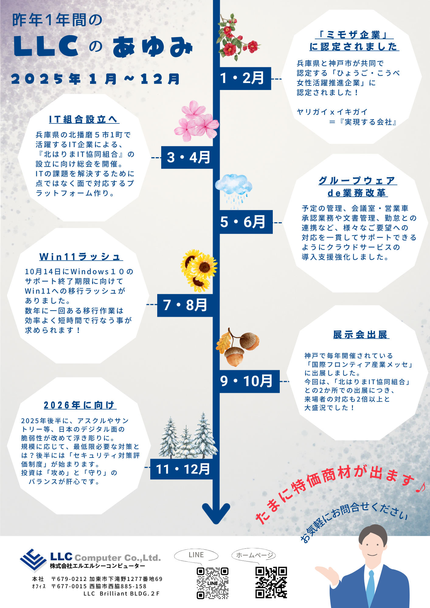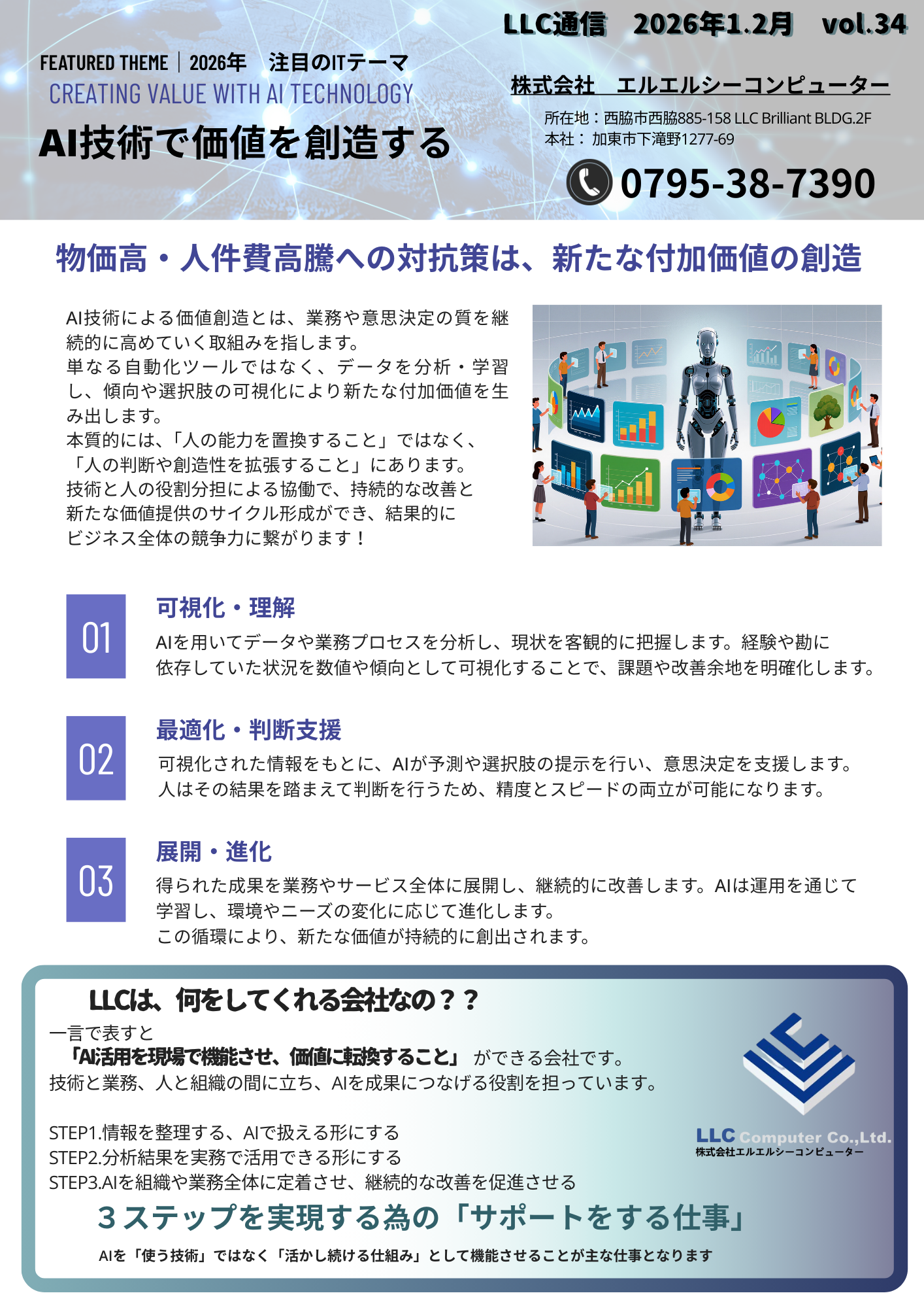 LLC通信 -vol.34 2026年1月20日 最終更新日時 : 2026年1月15日 llc-computer 「LLC通信 -vol.34」発刊しました。2026年注目のITテーマ『AI技術で価値を創造する』物価高や人件費高騰が話題となっている昨今。この問題への対抗策は、「新たな付加価値の創造」です。AI技術を用いて、①可視化・理解②最適化・判断支援③展開・進化この循環により、新たな価値が持続的に創出されます。裏面には、2025年のLLCのあゆみを掲載しています。LLCはAI活用を現場で機能させ、価値に転換するためのサポートをいたします。お気軽にお問合せください。
